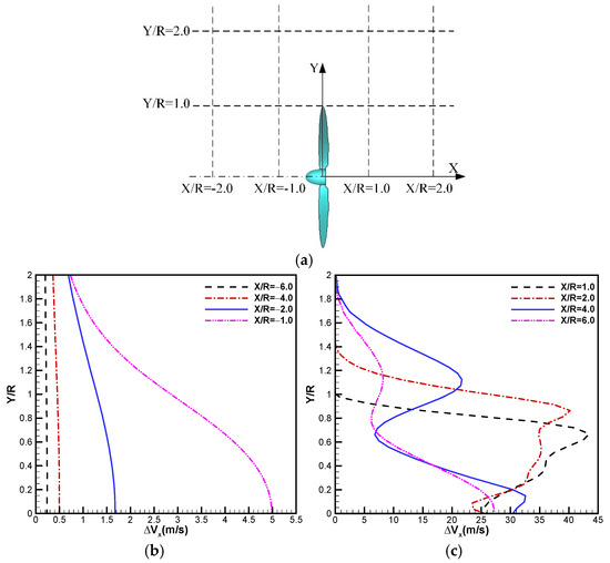 Judging from the distribution range of the axial-induced velocity increments, it can be determined that the affected area in front of the propeller disk is larger than that behind the propeller disk. Taking two axial positions, X/R = −1.0 and 1.0, as examples, for the constant value of X/R = −1.0, an induced velocity increment of 0.73 m/s can be obtained even at the radial position of Y/R = 2.0. In contrast, when X/R = 1.0, the radial influence range of the propeller slipstream only extends to Y/R = 1.0.