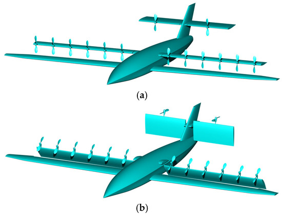A distributed electric propulsion biplane VTOL UAV: (a) schematic view of the aerodynamic configuration during the cruise phase; (b) schematic view of the aerodynamic configuration during the VTOL phase.