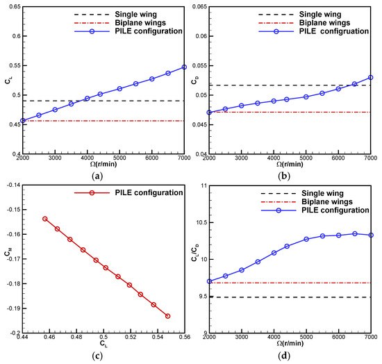 Impact of propeller speed changes on the PILE configuration. (a) Lift coefficient vs. propeller rotational speed; (b) drag coefficient vs. propeller rotational speed; (c) pitching moment about the leading edge of the main wing vs. lift coefficient; (d) lift-to-drag ratio vs. propeller rotational speed.