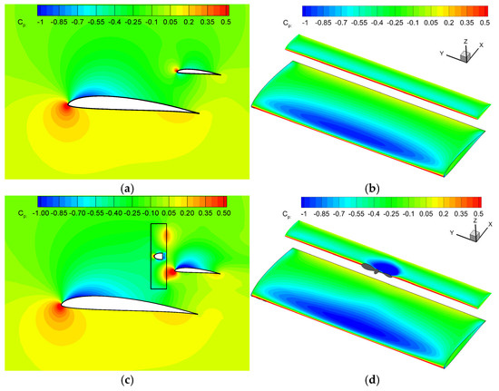 The aerodynamic advantages for the PILE configuration shown in Table 7 can be further illustrated by Figure 6. Figure 6a,b show the pressure contour plots for a clean biplane wing configuration. It can be observed that the pressure on the upper surface of the main wing near the leading edge is significantly lower than that on the corresponding position of the aided wing. The reduction in upper surface pressure indicates a more significant pressure differential between the upper and lower surfaces of the main wing, which results in increased lift generation.