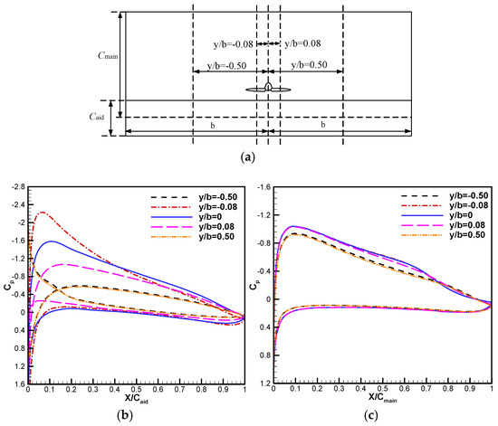 Chordwise pressure distribution of the main wing and the aided wing: (a) schematic illustration of spanwise sections; (b) chordwise pressure distribution of the aided wing; (c) chordwise pressure distribution of the main wing.