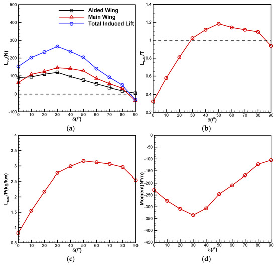 Figure 10d demonstrates the relationship between the pitching moment of the biplane wings and the propeller-tilt angle. It can be seen that the pitching moment about the leading edge of the main wing is closely related to the variation trend of the induced lift shown in Figure 10a. Since the induced lift of the biplane wings reaches its maximum at δ = 30°, the corresponding nose-down pitching moment is the strongest at this angle. As the propeller-tilt angle increases, the induced lift of the main wing and the aided wing decreases simultaneously, resulting in a reduction in the nose-down pitching moment.