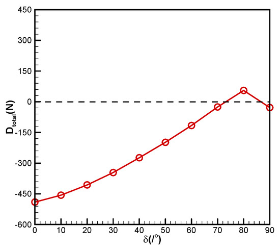 The relationship between the total drag of the PILE configuration with the propeller-tilt angle is given in Figure 11. It can be seen that the propeller-induced drag of the biplane wings is able to counteract the horizontal propeller thrust when the propeller-tilt angle is δ = 70°, resulting in a total drag close to zero. Further analysis of the composition of the propeller-induced drag (see Table 10) reveals that the aided wing is the primary contributor to balancing the horizontal thrust of the propeller, and it can contribute 81.6% to the total propeller-induced drag when δ = 70°.