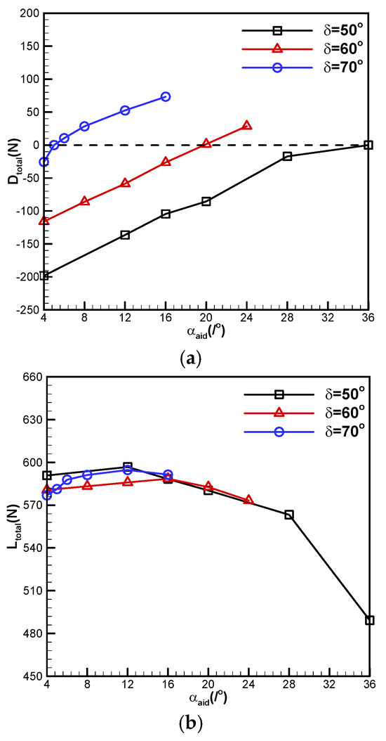 In addition to the total drag, the total lift also changes with adjustments of the aided wing installation angle. Figure 12b indicates that an increase in αaid (αaid should be less than 12°) is favorable for the total lift enhancement of the PILE configuration when δ = 70°. For the propeller-tilt angle of δ = 50°, however, increasing αaid beyond 12° actually results in a decrease in total lift.
