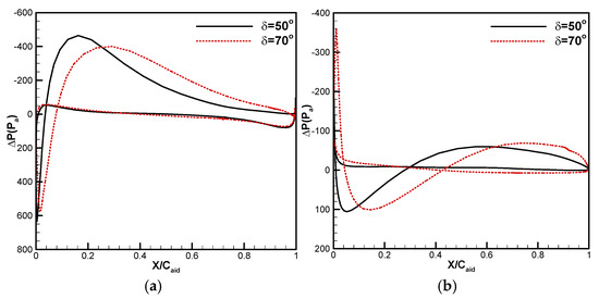 Figure 14 compares the chordwise pressure distribution of the aided wing at spanwise positions of y/b = −0.08 and y/b = 0.08 during the VTOL phase. For the tractor propeller configuration, which is formed by the propeller and the aided wing, the rotational propeller slipstream causes both upwash effect (Figure 14a) and downwash effect (Figure 14b) on the aided wing. These effects significantly alter the actual angle of attack of the aided wing, thereby increasing or decreasing the aerodynamic forces on the corresponding spanwise sections. In Figure 14a, it can be seen that the upwash effect significantly enhances the induced lift at the leading edge of the induced wing. The downwash effect of the propeller, however, causes negative lift over 30.0% Caid of the aided wing when δ = 50° (Figure 14b). When the propeller-tilt angle is increased to δ = 70°, the region of negative lift on the aided wing expands to 42.6%Caid.