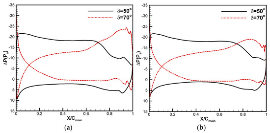 Chordwise pressure distribution of the aided wing during the VTOL phase. (a) Chordwise pressure distribution at the spanwise position of y/b = −0.08; (b) chordwise pressure distribution at the spanwise position of y/b = 0.08.