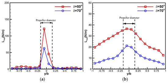 Comparison of spanwise lift distribution with and without propeller interference: (a) spanwise lift distribution of the main wing; (b) spanwise lift distribution of the aided wing.