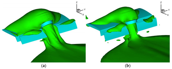 It can be found that the propeller slipstream is obstructed by the ground and flows radially outward when the propeller-tilt angle is increased to a certain range. Part of the propeller slipstream moves in the opposite direction to the airflow induced by the propeller; the shear interaction between them results in a vortex. When δ = 30° (see Figure 13a), multiple vortices are located near the trailing edge of the main wing. As the propeller-tilt angle increases, the multiple vortices move forward significantly and change the angle of attack of the main wing. Comparing Figure 13b,c, it is evident that the actual angle of attack of the main wing at δ = 70° is significantly smaller than that at δ = 50°. When the propeller-tilt angle is increased to δ = 90°, the induced velocity of the airflow caused by the propeller is vertically downward, which causes the local angle of attack of the main wing to be negative and leads to negative lift and lift loss phenomenon [2]. Therefore, it is demonstrated again that the optimal VTOL approach for the PILE configuration is not to tilt the propeller by 90° to provide direct lift but to match an appropriate propeller-tilt angle to optimize the sum of the induced lift of the biplane wings and the vertical thrust of the propeller.