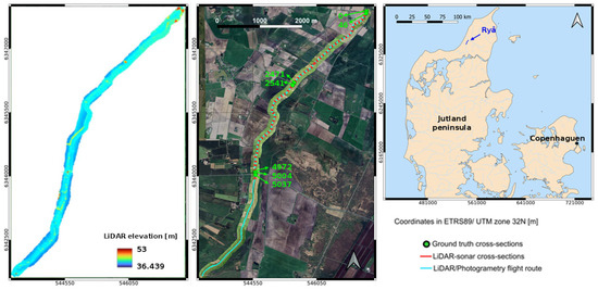 Area of interest and overview of the survey. Left image shows the LiDAR data over the entire river reach. The middle image shows the photogrammetry data, and the cross-sections with the ground-truth locations. The right image shows the map of Denmark indicating the location of the stream.