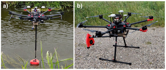 The sonar payload was mounted on the UAV with a rigid, foldable telescopic-arm solution, as seen in Figure 2. The rigid arm solution was unfolded with a remotely operated winch mechanism to bring the telescopic arm to a vertical position and the sonar in contact with water to start measuring the depth (Figure 2a). It was then folded back up as in Figure 2b to fly to the next cross-section. The float carrying the sonar can freely move vertically, ensuring that the sonar always stays on the water surface, even when the flight altitude changes during maneuvers or in the case of waves. The main advantage compared to the tethered sonar solution presented by [19] is that the horizontal position of the sonar is always identical to that of the UAV. Thus high-accuracy horizontal coordinates for the sonar depth are available directly from the flight log, and no optical tracking procedures are needed as in [19].