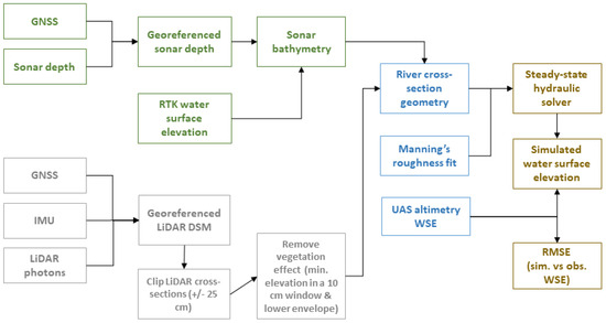 The overall aim of this paper is to show the potential of a full UAS hydrometric solution for hydraulic characterization of a river. LiDAR and sonar measurements can be used to define cross-section geometry. In addition, altimetry measurements of the WSE can be used with a 1D hydraulic model to fit unobserved Manning’s roughness (Figure 1).