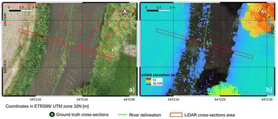 The LiDAR point cloud was processed with the software LAStools 1.3 (http://rapidlasso.com/LAStools, 15 October 2024). This tool can visualize the point cloud, filter observations, and create a digital surface model. Due to the low energy of the LiDAR, the WSE cannot be measured [32], but it can be used to extract the land elevation in the surroundings of the river. Figure 4 show the LiDAR data (b)) with the corresponding orthophoto (a)). The LiDAR data capture the surface elevation from both the land and vegetation, but they do not capture the WSE, only obtaining returns on the central area where the underwater vegetation is very dense, as observed in the orthophoto. The point cloud was clipped to extract elevation points in a 25 cm distance from each cross-section. These points were averaged to project them to the cross-section line.