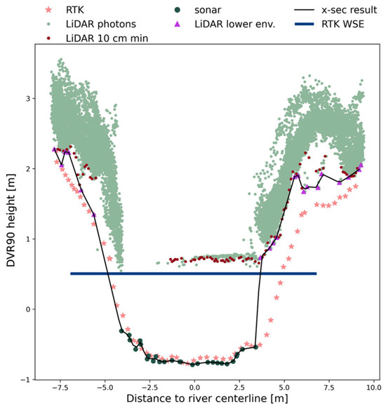 A Trimble RTK GNSS R8s (Trimble Inc., Westminster, CO, USA) was used to measure the WSE in situ at each cross-section. The sonar depth was subtracted from WSE to obtain the bathymetric profiles. In addition, we used conventional cross-section measurements with the RTK GNSS for seven river cross-sections as ground-truth observations. Along these seven cross sections, the river bottom elevation was measured every 30 cm using the Trimble RTK system. These conventional surveys are very accurate but time-consuming, with a very high cost/area ratio [15,23].