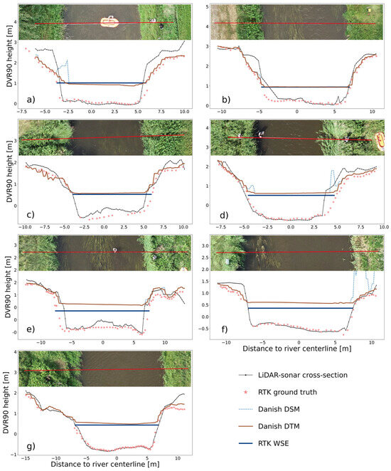 Combined LiDAR–sonar cross-sections with the corresponding orthophotos and ground-truth measurements from RTK at different chainage points: (a) 0 m, (b) 46 m, (c) 2471 m, (d) 2541 m, (e) 4972 m, (f) 5004 m, and (g) 5037 m.