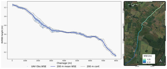The WSE measurements present a clear slope change at chainage 6600 m and 3000 m that can indicate presence of vegetation, depth change, or river width change.