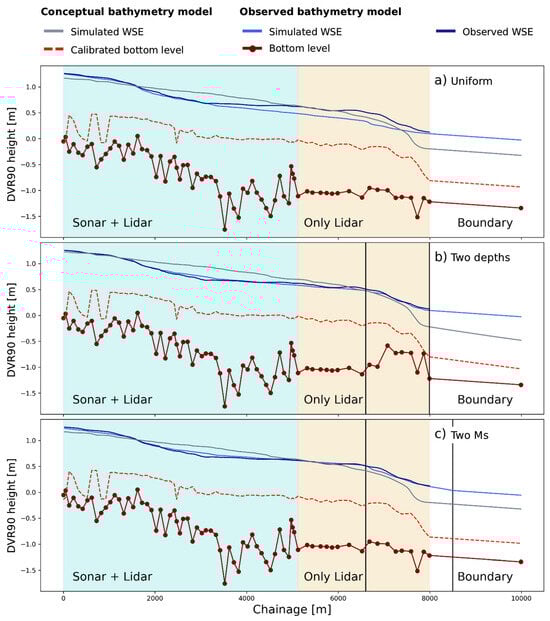 In Figure 8, we can see the results of the three different scenarios for the observed bathymetry model and conceptual bathymetry model reveal the following: The results assuming variable parameters in case (b) and (c) significantly reduced the RMSE, which makes clear that the uniform calibration (a) is not parsimonious. The brown line in Figure 8 represents the deepest cross-section bottom level, with the dot corresponding to the observed cross-section location. The bottom level seems quite irregular, with significant depth changes from one cross-section to another, which might be an indication of underwater vegetation changing the depth measurements in some areas. The red dashed line represents the calibrated conceptual bottom level, where we can observe that it is around 1m above the observed bottom level in some areas.
