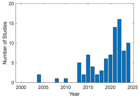 The keywords considered when compiling the research studies for this review included ‘wind turbine inspections’, ‘drone inspections’, ‘wind turbine damage assessments’ and ‘wind turbine sensing technologies’, as well as a combination of these terms. Furthermore, specific drone and inspection synonyms were used, such as ‘UAV’ and ‘monitoring’. Relevant publications were collected from a wide variety of online databases, such as Google Scholar, IEEE Explore, Web of Science, ResearchGate and Scopus, as well as other journal websites relevant to this field. Figure 3 shows the increasing frequency of review studies directed towards wind turbine inspection technologies. Evidently, the figure illustrates the increasing interest in reviewing wind turbine damage assessment and inspection technologies as well as their impact. However, all previous reviews typically omit the growing potential of multimodal drones for these inspections, hence creating the motivation for this work. In fact, this review angle is believed to be important as the field of multimodal drones has recently shown remarkable growth with new design concepts, such as [12,13,14,15,16], providing insight into the potential of future technologies in this field.