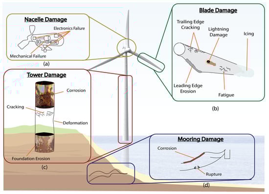 Following installation, the clock starts ticking with respect to the lifetime of a wind turbine. Without regular inspection and maintenance, this lifetime will become much shorter depending on the environment in which it is placed. That said, wind turbines have various levels of damage, where some are obvious and seen readily and others are far more discrete and are much harder to spot, making detecting these defects much more difficult. Figure 5 illustrates some examples of the distinct types of damage that occur in many stages and in different forms across the wind turbine, including nacelle damage, blade damage, tower damage and mooring damage.