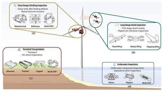 Possible drone solutions for the different systems of wind turbines and the diverse types of inspections involved: (a) close-range climbing, (b) long-range aerial, (c) terrestrial and (d) underwater inspections.