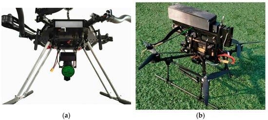 Multi-rotor UAV with a launch device: (a) the launch device is located below the UAV; (b) the launch device is located above the UAV.
