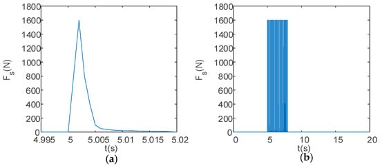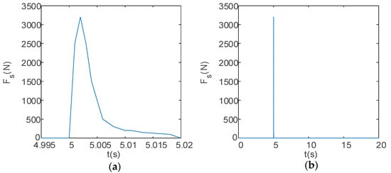 The total calculation time for the entire motion process of the UAV is set to 20 s. The desired height of the UAV is set to 5 m. At 5 s into the flight, the launch device begins firing. The variation in the recoil force Fs experienced by the launch device over time is detailed in Table 2 and shown in Figure 4 and Figure 5: when the UAV fires a large payload in a single shot, these data simulate the scenario of firing a rocket projectile or a capture net, with a total impulse of 13.53 N·s (see Figure 4); when the UAV fires a small payload in a burst, the total impulse per shot is 3.983 N·s, and the total impulse for 30 shots in a burst is 119.49 N·s (see Figure 5).
