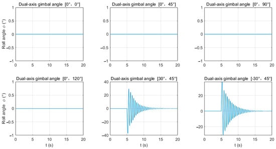 For the pitch angle θ, among the three attitude angles, it has the largest range of variation. During the firing process (5–8 s), regardless of forward or lateral firing, the pitch angle fluctuates around θ = −25°. After the drone completes a burst of fire (8–20 s), the pitch angle fluctuates around θ = 0° and then gradually adjusts back to the initial attitude (θ = 0°). Throughout the entire process (0–20 s), according to Table 5, when α = 0°, β = 30°, (θmin, θmax) = (−42.07°, 19.9°); when α = 0°, β = 90°, (θmin, θmax) = (−70.08°, 33.02°). It can be observed that the closer the -axis gimbal angle β is to 90°, the greater the fluctuation amplitude of the drone. When the firing angles are α = 0°, β = 90° and α = 0°, β = 120°, the absolute value of the pitch angle θ exceeds 55°, surpassing the UAV’s limited attitude angle, making the UAV prone to crashing. When β = 45°, for forward firing (α = 0°), (θmin, θmax) = (−52.34°, 33.54°), while for lateral firing (α = 30°), (θmin, θmax) = (−67.25°, 37.15°). It is evident that the pitch angle θ fluctuates more during lateral firing than during forward firing, with the absolute value exceeding 55°, making the UAV prone to crashing.
