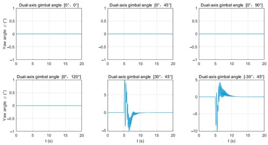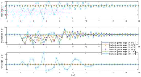 This section begins by analyzing, through simulation, the impact of the two-axis gimbaled platform connecting the UAV and the launch device on the UAV’s attitude and torque changes during heavy-load single-shot firing at various orientations. Subsequently, the analysis examines the effects of firing on the UAV’s position and lift force.