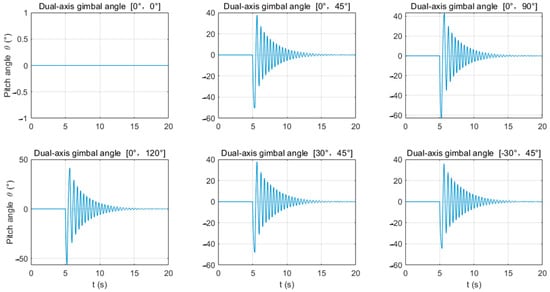 As shown in Figure 8 and Table 3, except for firing vertically towards the ground (gimbal firing angle α = 0°, β = 0°), when firing at any other angle, the UAV’s pitch angle θ will change, as will the UAV’s control torque . Under the influence of the recoil force, the pitch angle θ is initially negative, with its maximum and minimum values having a small difference in magnitude. When firing in the horizontal direction (α = 0°, β = 90°), the pitch angle’s range of change is the greatest (θmin = −63.089°, θmax = 43.614°). This is due to the maximum torque exerted on the pitch angle by the recoil force. At this point, the attitude angle exceeds 55°, and the UAV may crash due to excessive attitude. It is recommended that the UAV should fire downwards (β < 90°).