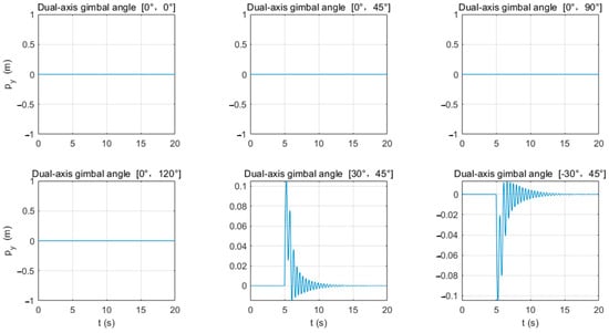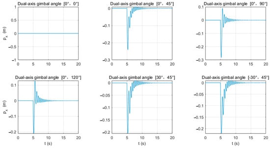 From Figure 9, it can be observed that when the gimbaled mount rotates around the -axis and fires in the positive direction of the -axis, except for the case of firing straight down (i.e., β = 0°), in other cases, the UAV will initially move in the negative direction of the -axis under the influence of the recoil force and then gradually adjust to a balanced position. Particularly when the gimbaled mount on the -axis is rotated to a larger angle (β > 45°) for firing, the UAV will first move in the negative direction of the -axis and then adjust to the positive direction of the -axis. According to the data in Table 4, as the rotation angle of the gimbaled mount on the -axis increases, the distance the UAV moves in the positive direction of the -axis also increases. For example, when the rotation angle of the gimbaled mount is α = 0°, β = 120°, the UAV moves almost entirely in the positive direction of the -axis by 0.129 m.