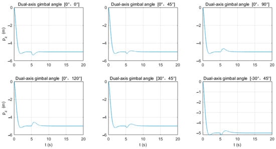 For the horizontal direction, during the firing process (5–8 s), under the influence of the recoil force, the UAV’s center of mass fluctuates around ≈ −0.1 m from the initial position ( = 0 m). After the firing is completed at the 8th second, the UAV’s position in the direction fluctuates around ≈ 0 m and tends to stabilize. Specifically, between 5 and 8 s, according to Table 6, when α = 0°, β = 30°, there are (min, max) = (−0.085, 0.006) m; when α = 0°, β = 120°, there are (min, max) = (−0.245, 0.055) m, which is 3.3 times the former. It can be seen that the larger the -axis gimbaled firing angle β, the greater the fluctuation amplitude of the UAV in the direction, mainly in the negative direction of the -axis, and the farther the fluctuation center value is from = 0 m. When β = 45°, for forward firing (α = 0°), (min, max) = (−0.0873, 0.011) m; for lateral firing (α = 30°), (min, max) = (−0.302, 0.505) m, which is 8.2 times the former. It can be seen that the UAV’s position fluctuation amplitude in the direction is greater during lateral firing than during forward firing.