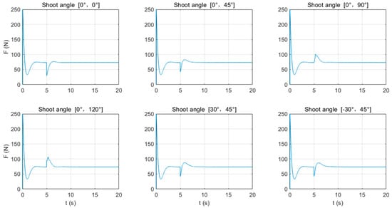 From Figure 11 and Figure 12, it can be observed that when the gimbaled mount rotates around the -axis and fires in the direction of the ground (β ≤ 45°), the lift force F required by the UAV decreases, causing the UAV to rise and move in the direction of the sky (negative direction of the -axis), while when β > 45°, the lift force required by the UAV increases. According to the data in Table 4, when α = 0°, β = 0°, Fmax = 76.452 N; when α = 0°, β = 120°, Fmax = 106.787 N. In this case, the UAV’s height above the ground decreases, moving in the direction of the ground (positive direction of the -axis).