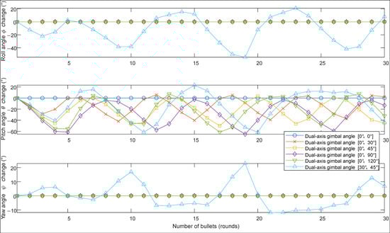 From Figure 13, it can be seen that when the -axis gimbaled angle is α = 0° and firing is carried out in the forward direction, there will be no change in the roll angle ϕ and yaw angle ψ. Adjustments to the roll angle ϕ and yaw angle ψ only occur when the -axis gimbaled mount is rotated for lateral firing (α ≠ 0° and β ≠ 0°).
