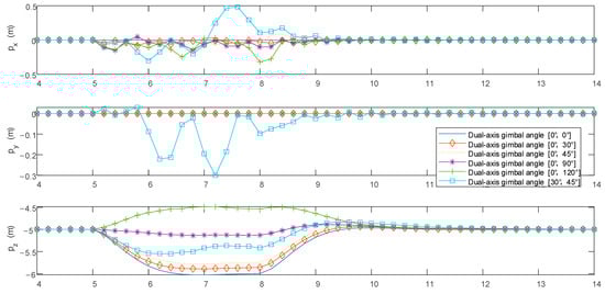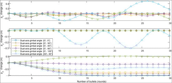 From Figure 15, it can be observed that when the -axis gimbaled angle α is 0° and firing is carried out in the forward direction, the UAV’s center of mass only experiences displacement in the vertical and horizontal directions. When the -axis gimbaled mount is rotated for lateral firing (α ≠ 0°, β ≠ 0°), it causes displacement in the directions.