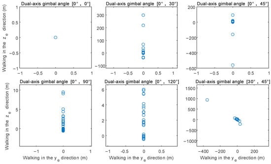 For the target located at = 5 m, when the projectile firing interval is 0.1 s, at different shooting angle conditions, the positional differences between the 30th shot and the 1st shot in the and directions are shown in Figure 17. It can be observed from the figure that lateral shooting produces errors in both the and directions; vertical downward shooting has the highest precision. When shooting at angles from 0° to 90° and 0° to 120°, the dispersion is within 10 m, while dispersion from other angles exceeds 100 m.