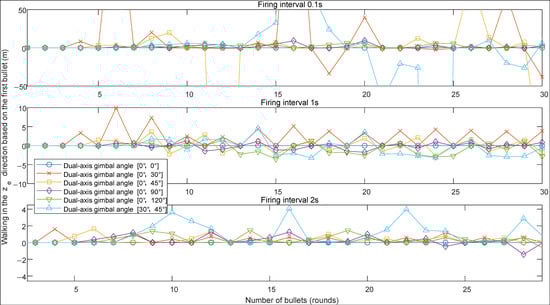 When the shooting interval is extended from 0.1 s to 1 s and 2 s, Figure 18 and Table 7 illustrate the positional difference between the 30th shot and the 1st shot in the direction (shooting errors exceeding 50 m are considered meaningless and thus not displayed in Figure 18). The charts show that when the shooting interval is extended to 1 s, the maximum dispersion in the direction for shots taken in various attitudes is less than 10 m; when the shooting interval is extended to 2 s, the maximum dispersion in the direction for shots taken in various attitudes is less than 5 m. Under different shooting intervals, the dispersion effect is optimal when the shooting angles are between 0° and 90° and between 0° and 120°.