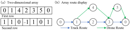 We present the path representation of TGGA, as shown in Figure 2. Utilizing both a drone and a truck, we employ a two-dimensional array to depict the travel path. The first row of the array specifies the tasks to be performed by each mode of transportation. The second row indicates the mode of service with “−1”, “0”, and “1” (“0” for tasks performed by the drone, “1” for tasks performed by the truck carrying the drone, and “−1” for tasks performed by the truck alone). For the special depot point, we stipulate that the first row uses “0” and the second row uses “1” to represent it.