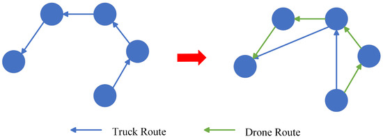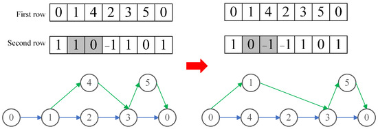 Upon acquiring a high-quality initial solution, we systematically alter the execution method of the tasks on the path to enhance route optimization. In particular, we switch task points between the truck and the drone to enhance efficiency. Specifically, we change the “1” or “−1” in the second row of the array to “0”, or change “0” to “1” or “−1”, with a maximum of two points being modified each time (Line 18). As shown in Figure 3, we change the execution methods between task 1 and task 4. After the change, task 1 is carried out by the drone, so the corresponding position in the second row is marked as “0”. Meanwhile, task 4 is completed by the truck, so the corresponding position in the second row changes from “0” to “1”. However, since the truck is not carrying the drone at this moment, the corresponding position in the second row changes from “1” to “−1”. Alternatively, tasks currently performed by the truck but meeting the conditions for drone execution will be reassigned to the drone (Line 20), as depicted in Figure 4. The conditions for a task to be executed by the drone are as follows: