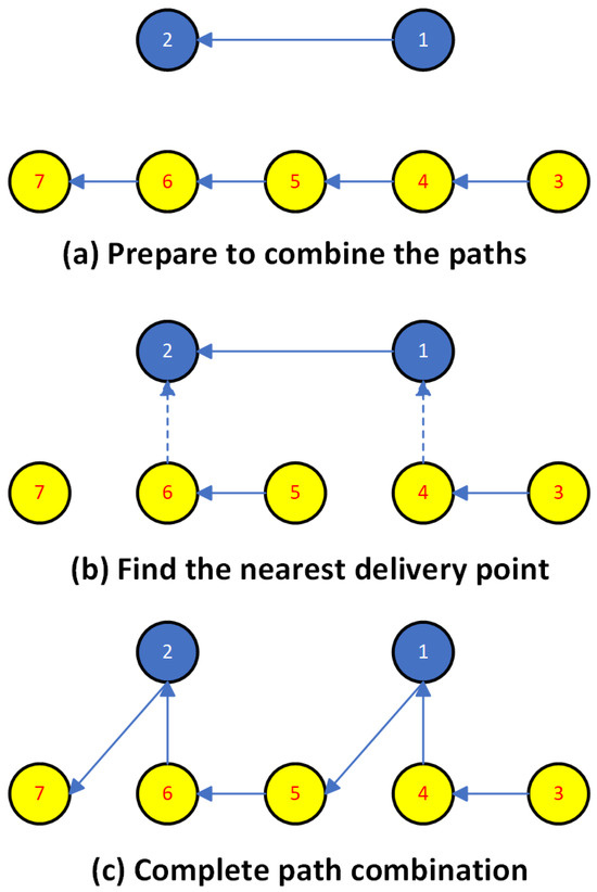 After determining the delivery path, we implement a greedy strategy to integrate the monitoring and delivery paths. As illustrated in Figure 6, we insert the closest delivery task to the monitoring task. If the delivery task has not yet merged, all preceding delivery tasks in the sequence will be inserted before the monitoring task. In the event that this delivery task has already been integrated with other monitoring tasks, the subsequent nearest delivery task will be selected until all delivery points are fully incorporated. For delivery locations that cannot be incorporated before any monitoring task, we position them sequentially after the final monitoring task.