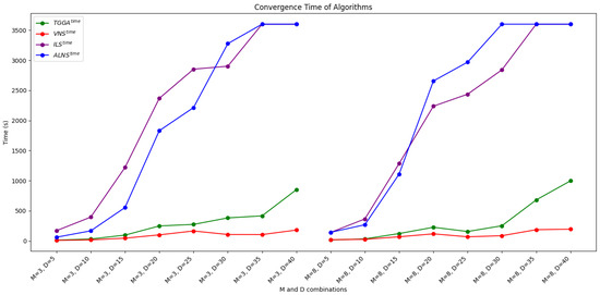 To further compare the performance of the four algorithms, we recorded the convergence times of each algorithm within 100 generations. If an algorithm exceeded 3600 s during the 100 generations, it returned the current optimal cost. The data in Figure 8 indicate that VNS has the shortest convergence time among the three algorithms, followed by TGGA, while the convergence times of ILS and ALNS are notably longer than those of VNS and TGGA. From a theoretical perspective, the time complexity of the most complex operator in VNS is , while the time complexity of the greedy combination operation in TGGA is . However, in the practical results illustrated in Figure 8, the convergence times for TGGA and VNS are quite similar. Although TGGA’s convergence time is longer than that of VNS, the analysis of optimal values shows that the extended convergence time of TGGA greatly reduces the optimization cost. In contrast, as the number of tasks increases, ILS and ALNS struggle to converge within the allotted time.