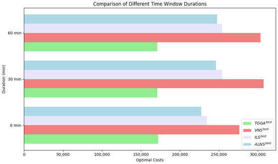 In this section, we set different durations (T) for the time windows, specifically, 0 min, 30 min, and 60 min. As shown in Figure 9, when the duration changes from 0 min to 30 min, VNS, ILS, and ALNS exhibit a slight increase, while TGGA remains stable. For the duration of 60 min, the costs of all four algorithms show little variation. This indicates that the duration has a minor effect on VNS, ILS, and ALNS, while it has almost no impact on TGGA.