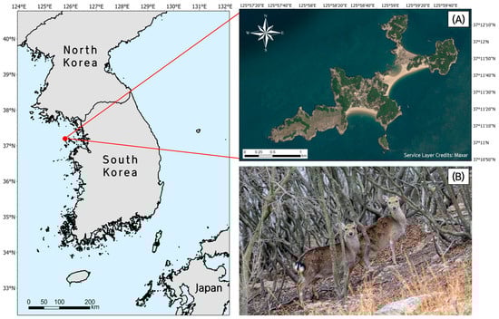 (A) Location of Guleopdo Island, Ongjin County, Incheon, South Korea, selected as the study site (Source: Esri, Maxar, GeoEye, Earthstar Geographics, CNES/Airbus, DS, USDA, AeroGRID, IGN, and the GIS User Community); (B) photograph of Formosan sika deer inhabiting Guleopdo Island.