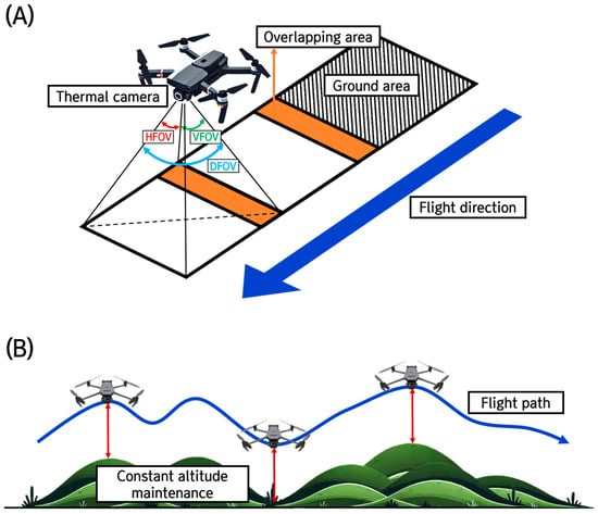 Depiction of thermal drone flight strategy and path execution. (A) Thermal drone detecting ground areas along designated waypoints. (B) Drone maintaining a constant altitude while traversing the flight path over varying terrain.