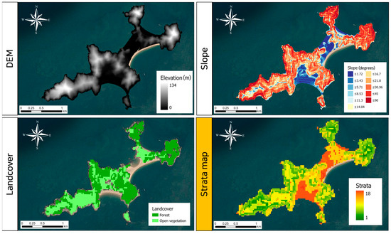 Input data used for generating the sampling strata and the resulting strata map. (Top left) DEM showing elevation across Guleopdo Island; (top right) slope map indicating terrain steepness; (bottom left) landcover map categorizing forest and open vegetation areas; and (bottom right) strata map generated from the integrated input data.