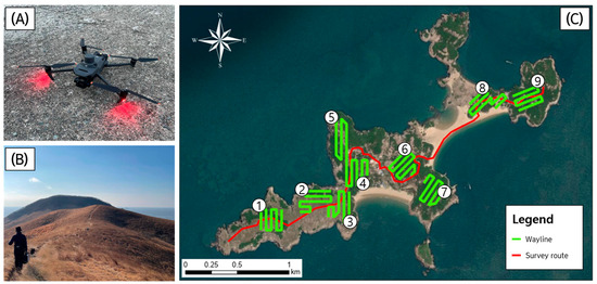 Field operation setup and finalized flight path on Guleopdo Island. (A) DJI Mavic 3T thermal drone used for wildlife detection. (B) Landscape view of Guleopdo Island. (C) Map showing the finalized flight paths (waylines) and survey routes used for wildlife monitoring.