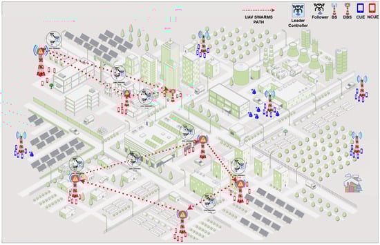 The system responds to situations where terrestrial BSs have failed, leaving UEs disconnected. Each UAV in the swarm functions as a mobile aerial base station, collaborating to dynamically adjust positions, trajectories, and altitudes to restore coverage. Figure 2 illustrates the overall system architecture, showing how UAVs interact with different environments to create reliable communication networks. By deploying a swarm rather than relying on a single MABS solution, the system can cover a wider area, adapt to dynamic user mobility, and ensure redundancy in challenging scenarios.