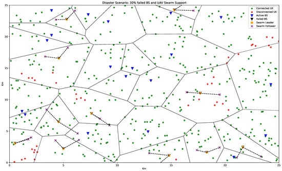 The Poisson distribution () used for UE distribution reflects the uneven population densities common in such scenarios, while failed base stations () simulate sporadic infrastructure damage. As observed in prior works [29], UAVs are well-suited for reconnections in regions with dispersed or clustered populations, and this setup ensures the test area is representative of real-world disaster scenarios. Red UEs in Figure 2 highlight disconnected users who receive immediate attention from the UAV swarm, whereas blue UEs remain unaffected by the disaster. Isolated UEs benefit from temporary reconnections established through UAV mobility.