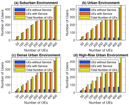 There are three different data rate requirements that was adopted in this study based on parameters detailed in prior work, particularly the study by [30], where these parameters were tested and validated under diverse UAV deployment environments for all UEs: , , and , where each UE has one of these three data rate requirements determined to ensure reliable communication, particularly in challenging disaster scenarios. This requirement is set by using the capacity equation (Equation (1)). where represents the data capacity allocated to UE i, denotes the total bandwidth available for communication and denotes the SINR of UE i. This formulation integrates user-specific quality of service (QoS) requirements () to ensure that all connected users meet or exceed their individual minimum data rate needs.