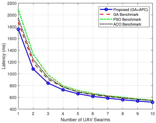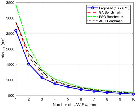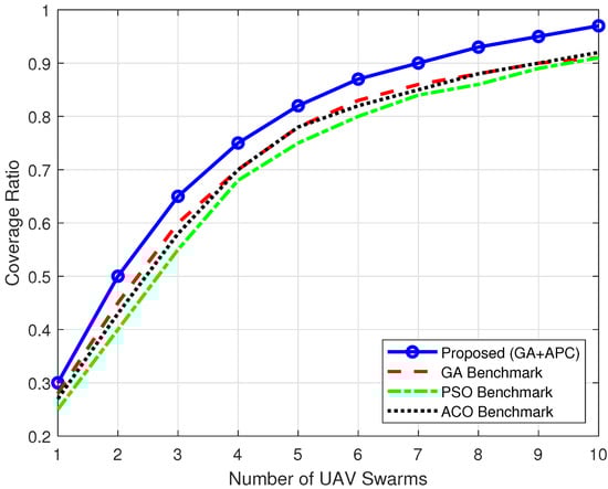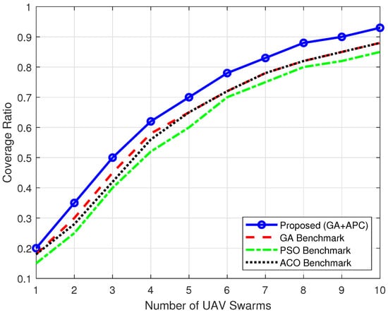Currently, the available works on UAV path planning performance fall into five broad categories based on user equipment (UE) mobility. The first category focuses on static UE, where trajectories are optimized assuming fixed user locations, often neglecting the impact of user mobility and dynamic environmental conditions (see [7,25,26,27,28,29,30]). The second category considers quasi-stationary UEs, where users are mostly stationary with occasional minimal movement, making mobility a minor factor in optimization (see [31]). The third category involves random mobility, where user movements are unpredictable, often modeled using stochastic processes, but without considering group or coordinated movement patterns (see [32,33,34]). The fourth category addresses controlled mobility, where user movements follow predefined or predictable patterns, such as coordinated evacuations or group mobility scenarios (see [35,36]). Finally, the fifth category where this study falls into is the dynamic UE, where user mobility is highly dynamic, requiring real-time adaptation to rapid changes in user distributions and network conditions. However, while works such as [29,37] have some commonalities with this study, such as base station losses, they lack several critical aspects that are addressed here. Specifically, these studies do not consider: (1) swarm UAVs, (2) different QoS requirements, (3) mobility models, and (4) dynamic environments. This work integrates all these dimensions, providing a comprehensive approach for optimizing UAV swarm trajectories in challenging disaster scenarios. This study uniquely addresses the impact of progressive base station losses, ranging from 10% to 90%, to evaluate the resilience and adaptability of UAV swarm path planning. By simulating increasingly severe failures, the necessity of dynamic path optimization is emphasized to restore coverage and maintain QoS compliance, even under extreme infrastructure disruptions. To ensure a fair and consistent comparison, well-established metaheuristic algorithms—GA, PSO, and ACO—were selected as benchmarks. These algorithms were implemented under identical simulation settings, including user mobility models, communication constraints, and base station loss scenarios. This approach ensures that the comparison highlights the unique contributions and effectiveness of the proposed hybrid APC-GA framework. On this basis, the study introduces a comprehensive approach to dynamically adapt UAV swarm trajectories while addressing the challenges of real-time mobility, communication constraints, and severe base station losses.