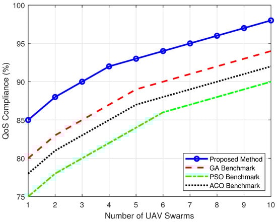 - Contribution 1: A QoS-aware fitness function for UAV swarm optimization: A multi-metric fitness function is proposed, integrating path length, and signal-to-interference-plus-noise ratio (SINR-based) QoS compliance. This ensures that UAVs maintain efficient and interference-free communication while minimizing resource consumption.