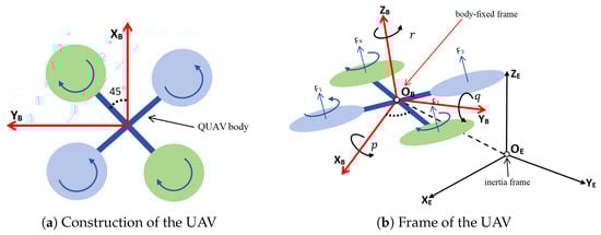 The UAV model is depicted in Figure 1, which includes a rigid cross frame and four rotors. For ease of describing the coordination configuration, the body-fixed frame is represented by , and the inertia frame is represented by .